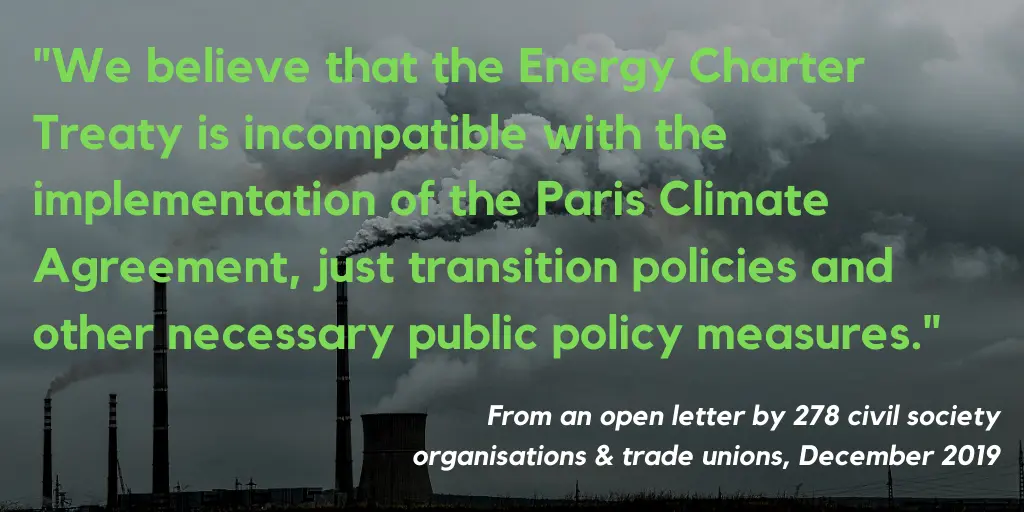 Tänään 278 kansalaisjärjestöä ja ammattiliittoa julkaisi avoimen kirjeen ja mukana Suomesta ovat Maan ystävien lisäksi 350 Suomi, EKOEnergia, Greenpeace, Luonto-liitto, Suomen luonnonsuojeluliitto sekä Suomen TTIP-verkosto. Kirjeessä vedotaan energiaperuskirjan sopimusosapuolina olevien maiden hallituksiin ja parlamentteihin, että ne vaatisivat fossiilisten polttoaineiden investointisuojan sekä sijoittajan ja valtion välisen riitojenratkaisumekanismin poistamista sopimuksesta. Tämä varmistaisi, ettei energiaperuskirja aseta esteitä hallitusten nopeille ja kunnianhimoisille ilmastotoimille, ympäristönsuojelulle tai kohtuuhintaisen energian saatavuudelle.