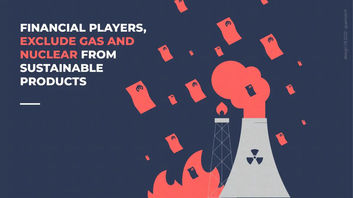 Me, Euroopan kansalaisjärjestöt, pyydämme rahoituslaitoksia sitoutumaan julkisesti jättämään maakaasun ja ydinvoiman kestäviksi tai vihreiksi markkinoitujen tuotteidensa ja joukkolainojensa ulkopuolelle. Tähän kuuluu myös näiden energialähteiden jättäminen 9 artiklan rahastojen ulkopuolelle [14].