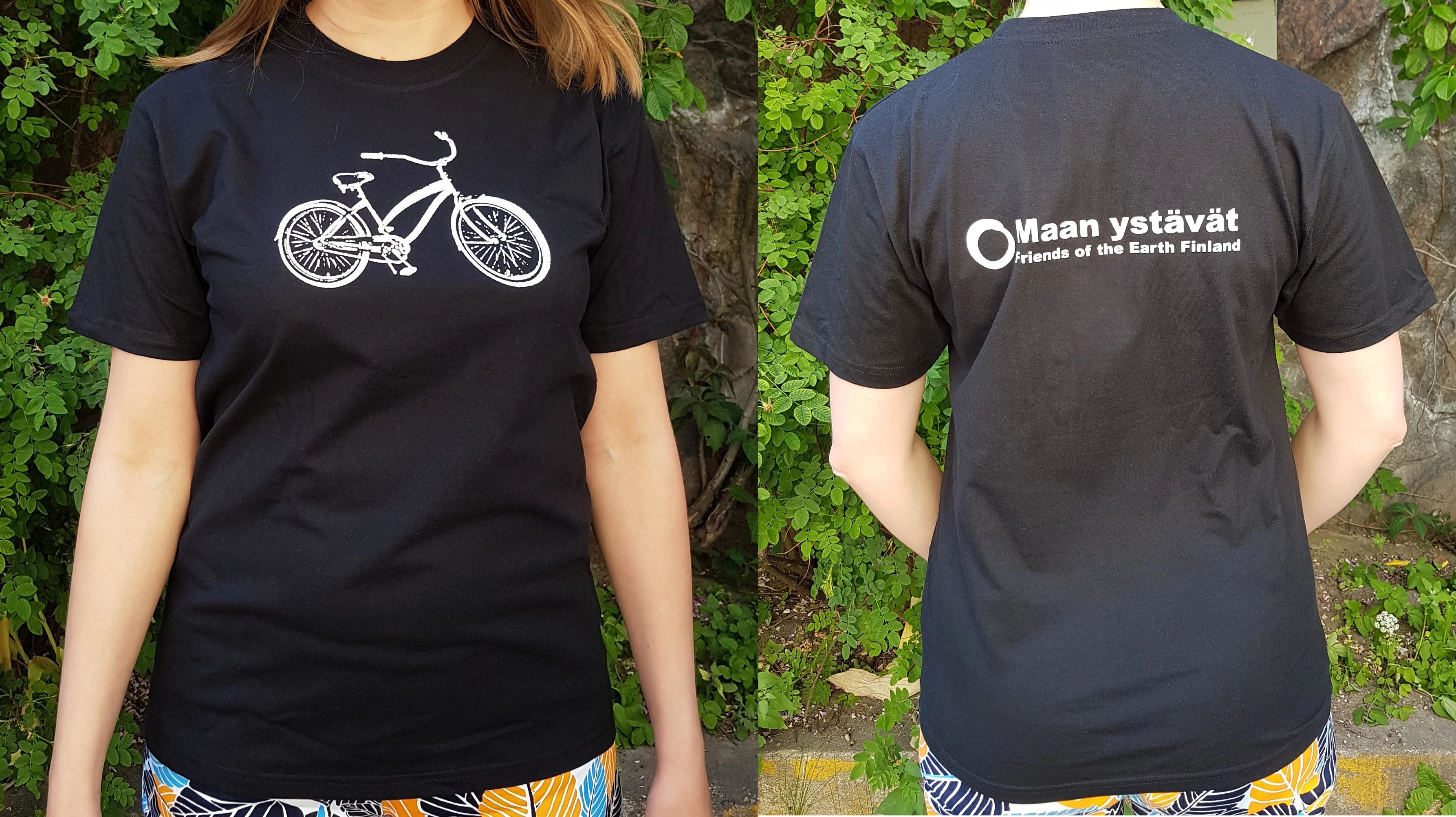Liittymällä Maan ystävien jäseneksi autat meitä toimimaan ekologisesti kestävän ja sosiaalisesti oikeudenmukaisen maailman puolesta. Kun liityt nyt, saat lahjaksi reilun kaupan luomupuuvillasta tehdyn t-paidan pyöräpainatuksella!